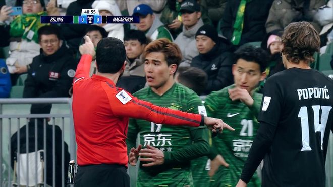 双方不断走马换将,国安换上了法比奥、林良铭等多名主力。第70分钟,国安后场传球出现巨大失误,柏杨禁区直接拉倒了对手,裁判毫不犹豫吹罚点球,哈里索耶一蹴而就,1:2!麦克阿瑟再度取得领先。丢球之后的国安,后防线依旧浑浑噩噩,不断送给对手快速反击的机会。最后时刻,双方的对抗更加激烈,黑尔韦远射击中横梁,跟上的塔尔博特补射,张健智高接低挡,国安禁区一片混乱岌岌可危。补时阶段,双方爆发冲突,柏杨累积两黄,红牌罚下。